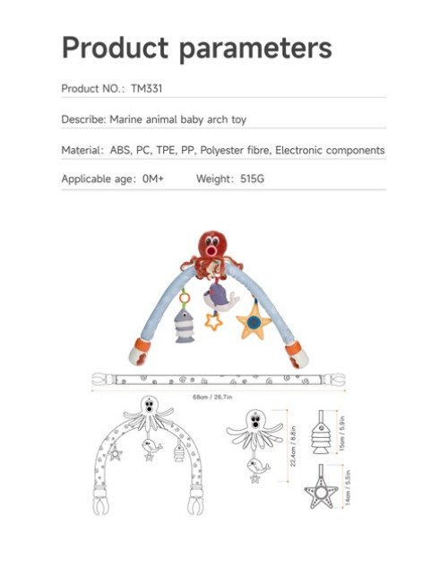 - Includes 1pc activity arch, 2pcs flexible clips, 1pc plush octopus rattle, 1pc fish rattle, 1pc star mirror and 1pc plush whale baby rattle with orange pentagram.