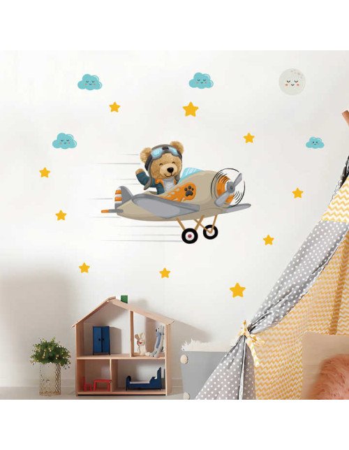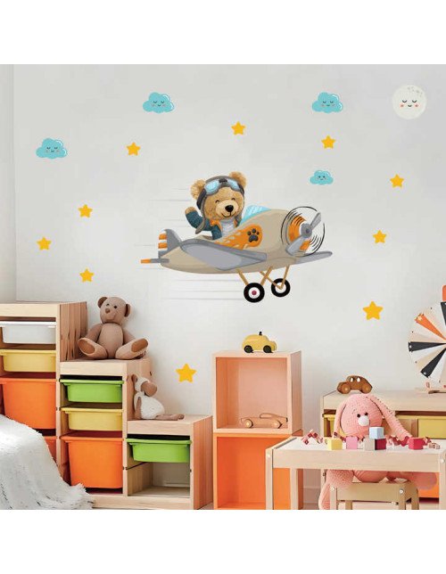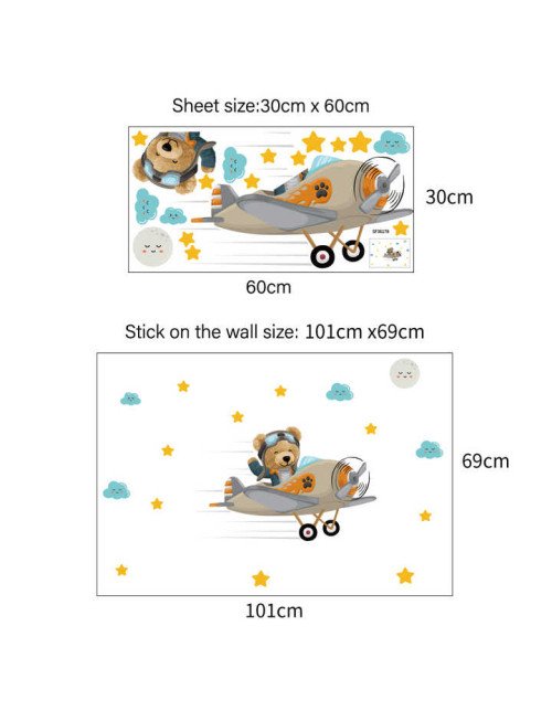 Self Adhesive Cartoon Bear With Airplane Kindergarten Wall Stickers