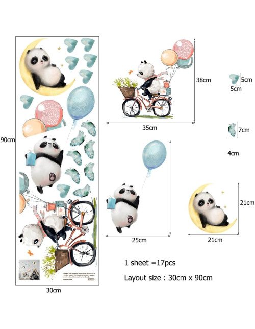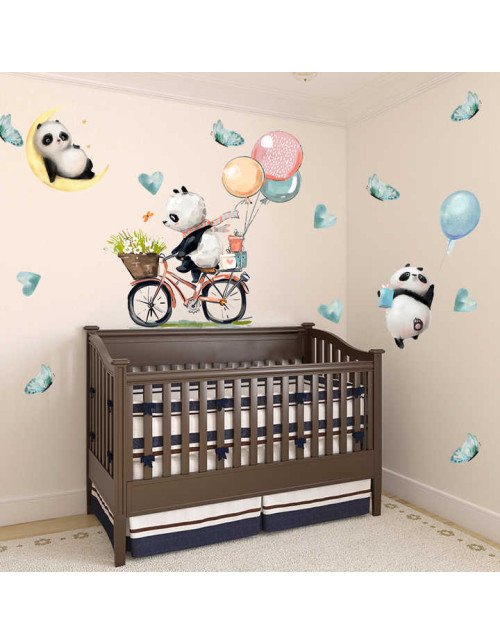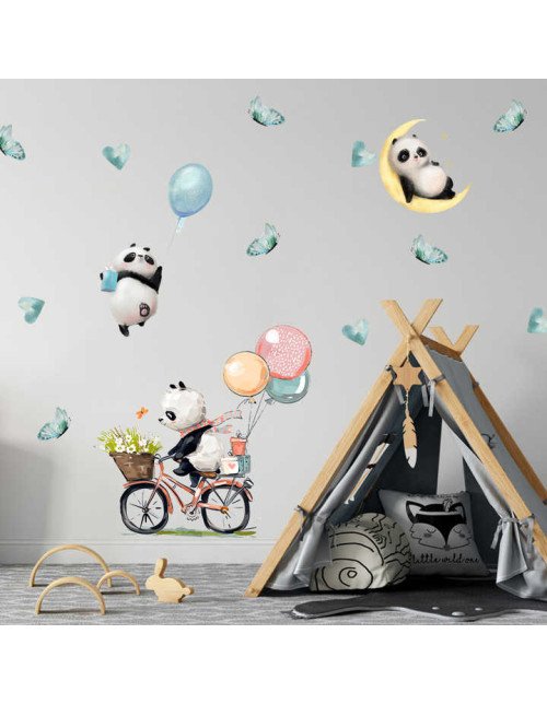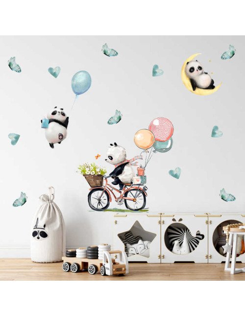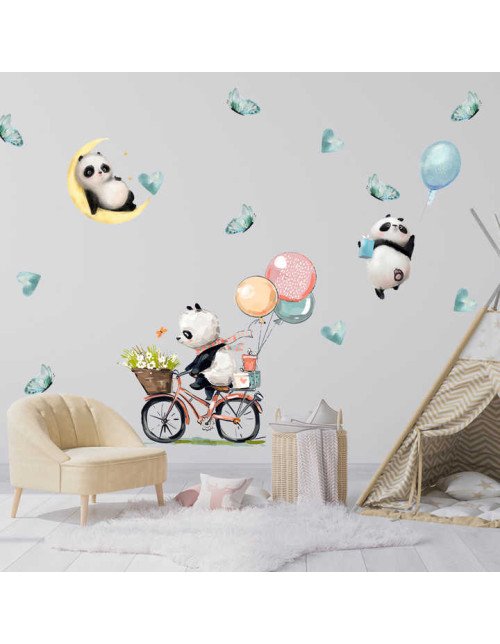 Self Adhesive Baby Room Wall Sticker New Design Pandas Ride Bicycles Stickers For Kids Room Decoration