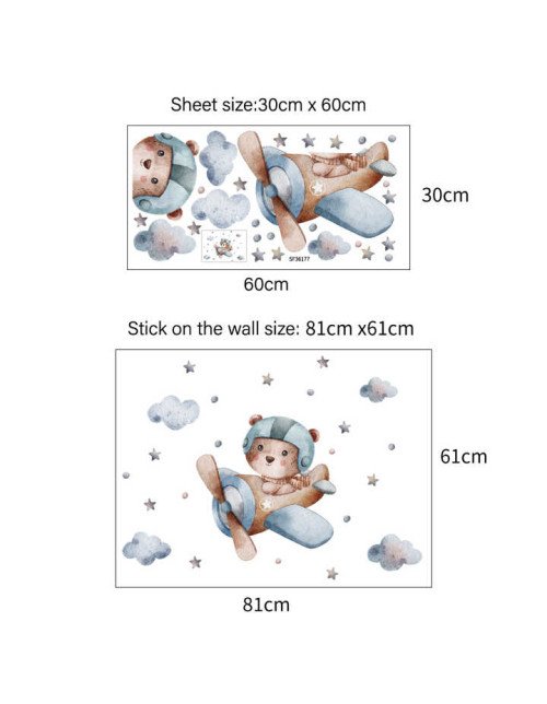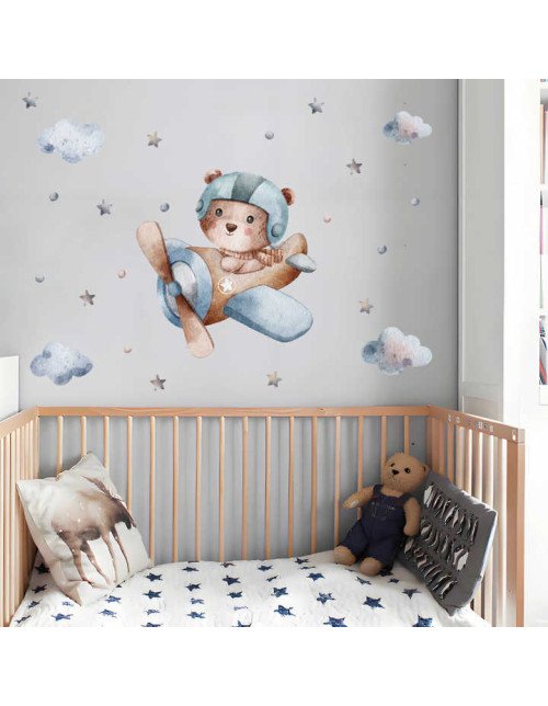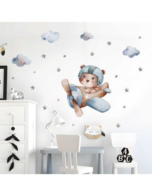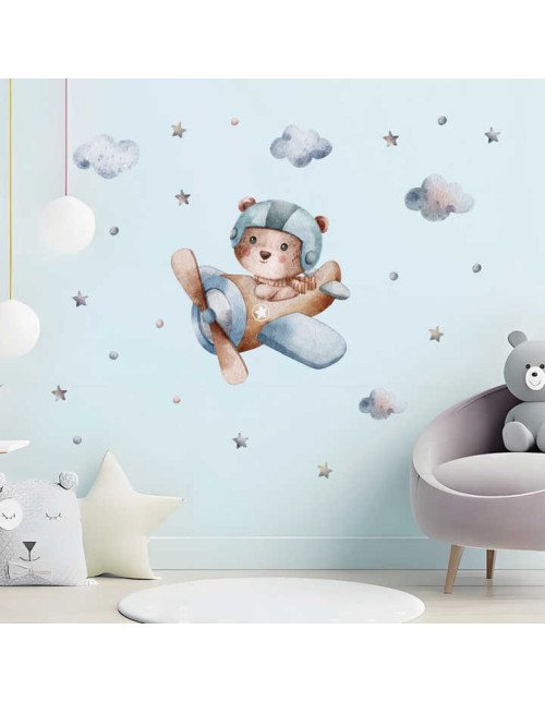 Removable Cartoon Bear Drive Airplane Sticker For Baby Room Wall