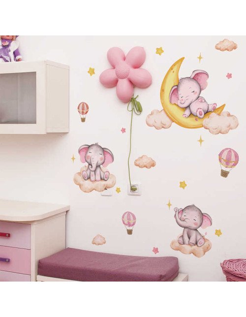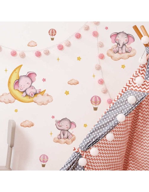 Hot Sale Removable Cartoon Pink Elephant With Cloud Wall Stickers Baby Broom