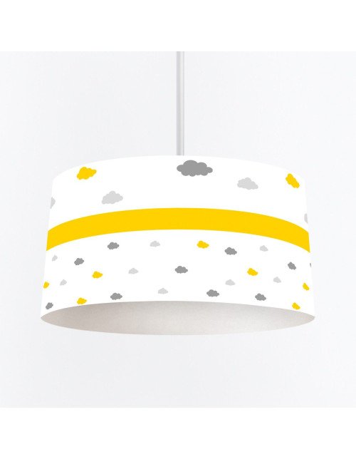 A charming ceiling lamp shade featuring playful cloud designs in yellow and grey, perfect for a child's room.