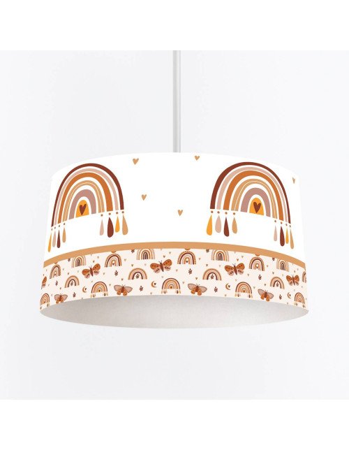 A vibrant ceiling lamp shade with a colorful rainbow design.