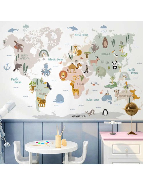 Kids Room Decoration Self-adhesive Cartoon Animal 3d World Map Wall Stickers